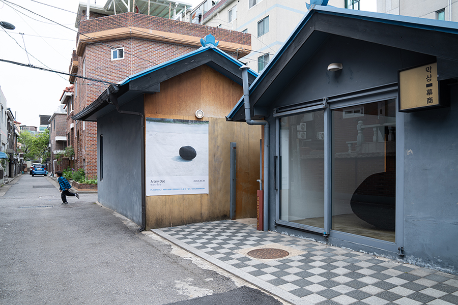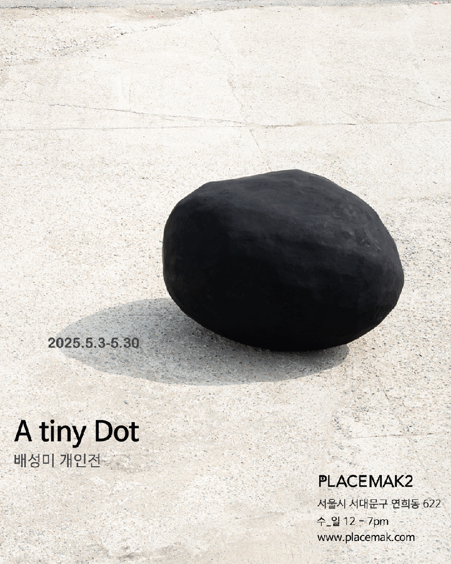 배성미의 개인전 《A tiny Dot》에 붙여진 작가 노트를 보며 나는 오래전 그 퇴근길의 기억을 떠올렸다. 화려한 불빛과 사람과 길과 차와 아파트가 스쳐 가고, 그 사이로 익숙한 고단함과 슬픔, 그리고 한편 상투적인 무심함이 스며든다. 내겐 조약돌 같았던 삶의 덩어리는 어느덧 배성미의 세계에서 작디작은 모래알이 되어 구르다가 또 어느 순간 커다란 바위가 되어 있었다. 감자 같은 바위다. ‘감자 같은 바위’와 ‘바위 같은 감자’가 자꾸 같아 보인다고 노래를 부르던 작가는 기어코 전시장 입구에 커다란 입체작품 〈감자같은바위 바위같은감자〉(2025)를 세웠다. 칠흑 같은 검은색, 밤의 빛을 머금은 덩어리다. 밤의 미덕이 있다면 그것은 모두에게 공통으로 주어지는 조건이라는 것이다. 누구에게라도 더하고 덜할 것도 없이 공평하게 어둠은 내린다. 어둠을 몰아내는 것은 욕망이다. 더 아늑한 주거 환경의, 빠른 이동을 위한 교통수단의, 자본주의적 향락을 위한 간판의 불빛, 불빛, 불빛들. 어둠 이외의 무언가를 더 원하고 더하는 것은 인간의 짓이다. 그러나 아무리 빛으로 환영을 덧씌워도 어둠 속에서 드러나는 몸을 가리지 못한다. 세상에서 저마다 꿰차고 있는 부피만큼, 꼭 그만한 모양의 실루엣으로 세상의 것들은 존재를 드러낸다. 결국 확인할 수 있는 것은 눈앞에 있는 덩어리로서의 물질이다. 여기-있다, 그것만큼 확실한 존재의 증명이 없다. 어둠 속에서 감자는 감자대로, 바위는 바위대로, 울퉁불퉁 제멋대로 생긴 대로 그렇게들 세상의 한 자리를 차지하고 스스로를 내보인다.